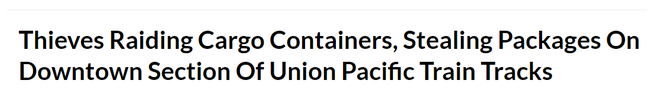 根据报道,联合太平洋公司(Union Pacific)表示,去年洛杉矶县针对其列车的盗窃案增加了160%,在过去三个月里,平均每天有90个集装箱被盗。据该公司估计,去年失窃造成的损失、损失和索赔共达500万美元。