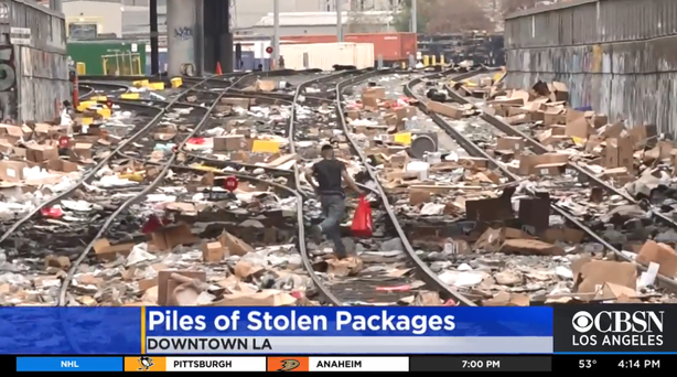 当CBSLA带着摄像机守在现场时,看到一个人拿着一个用来装小包裹的箱子逃跑;一名联合太平洋公司的警员追赶着另外两名似乎在偷盗包裹的人。