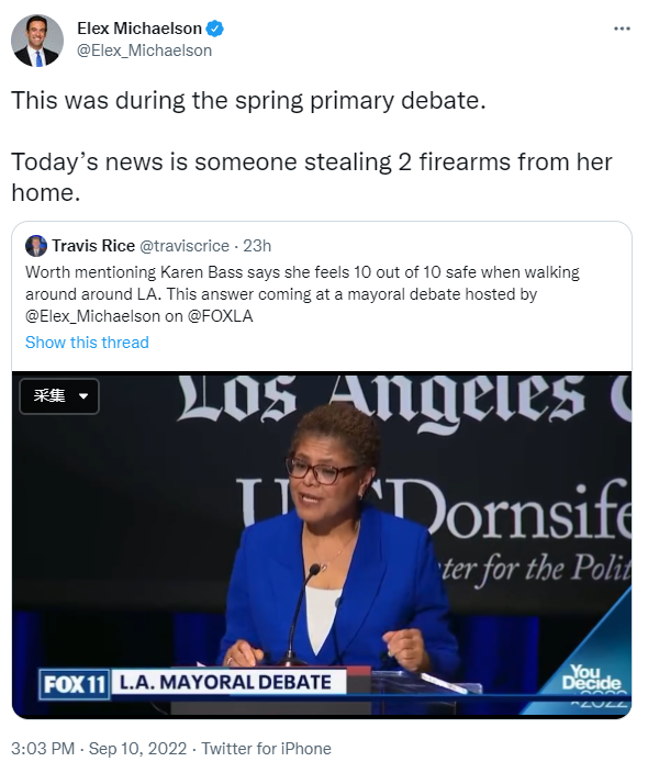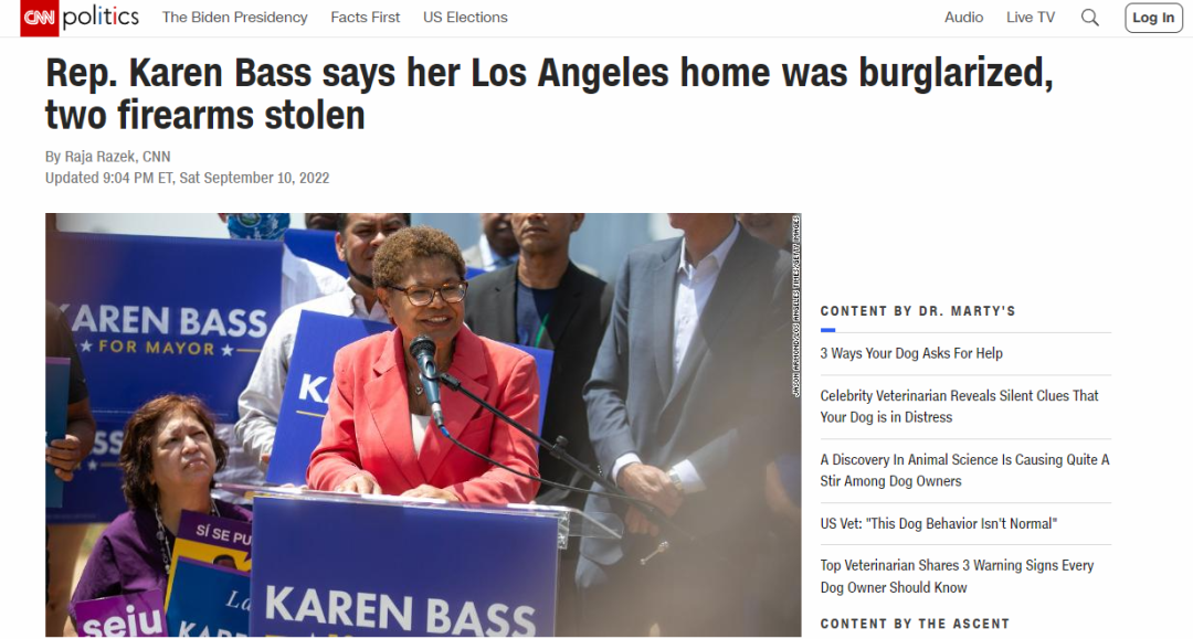 洛杉矶华人资讯网9月11日综合报道 洛杉矶市长候选人、众议院凯伦·巴斯(Karen Bass)表示,自家住宅在近日被人闯入,两支枪被偷走。而她在此前的市长辩论中曾声称,“在洛杉矶散步十分安全”。