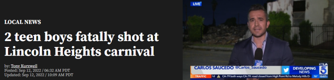 据ktla 9月12日报道 上周日晚上,林肯高地(Lincoln Heights)的一个街头狂欢节演变成了暴力事件,两名青少年遭枪击身亡。