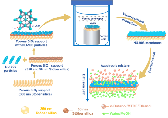 ▲图2. MOF薄膜的合成路线及渗透汽化分离过程示意图