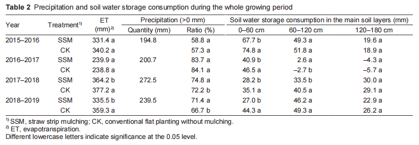 试验结果表明,SSM处理提高了0–180 cm土层的土壤水分,其中以冬小麦拔节期和开花期0–60 cm土层的效果尤为明显。与CK相比,SSM提高了降水对总耗水的贡献,且在生育前期显著提高了20.4个百分点。SSM显著降低了0–180 cm土层的水分消耗,最终减少生育期耗水11.2 mm。在0–180 cm土层,SSM在播种期–拔节期减少耗水33.1 mm,但在拔节期–开花期增加了19.5 mm。此外,SSM提高籽粒产量的水分利用效率21.6%,提高籽粒产量的降水利用效率18.6%,最终通过提高穗数9.5%、提高穗粒数8.9%,从而提高籽粒产量16.5%。SSM使生物产量的水分利用效率提高了13.5%,使生物产量的降水利用效率提高了9.9%,最终提高生物产量8.7%,增加株高6.5%。SSM还增加了413元/公顷的净收入,收获后预计秸秆还田总量可增加8876–9619千克/公顷。