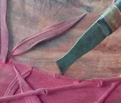 这种到是“V”字形的刀具。用于鸟禽羽毛雕刻,或花草的褶皱纹理,有粗变细。在雕刻时,手法需麻利,不能打颤。而且需要极其耐心,极其考验功夫。