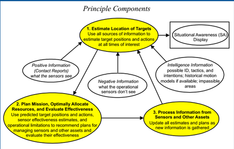 该能力使用由海军标准 STAPLE 系统、非高斯跟踪算法和非高斯资源优化算法生成的非同类环境数据来预测高关注度目标的未来位置并优化针对这些目标的搜索,使用户能够决定应当何时使用哪些资产(舰船、潜艇和飞机)在关注区域的何处具体位置进行搜索。