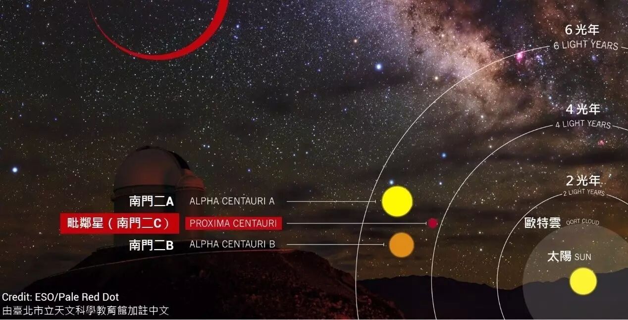 第二,除了太阳外,离地球最近的恒星是半人马座α星C,也就是大家常说的比邻星(Proxima Centauri),距离太阳只有4.24光年。距离地球排名第三近的是由半人马座α星A和半人马座α星B组成的南门二双星,距离地球4.36光年。