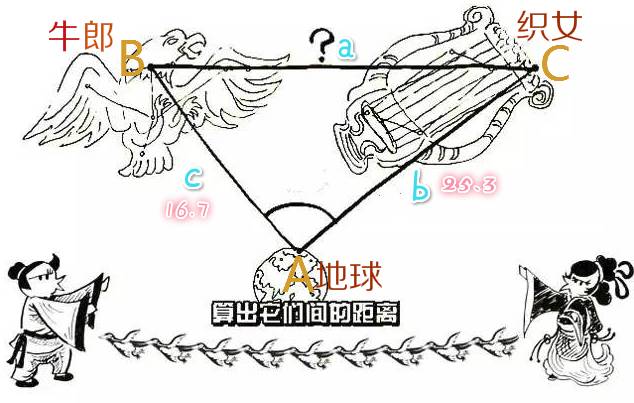 如果把牛郎星、织女星和地球看成一个平面三角,知道了三角形的两边,并算出两边的夹角,然后用余弦定理,我们就可以算出夹角的对边,即织女星和牛郎星的距离了。