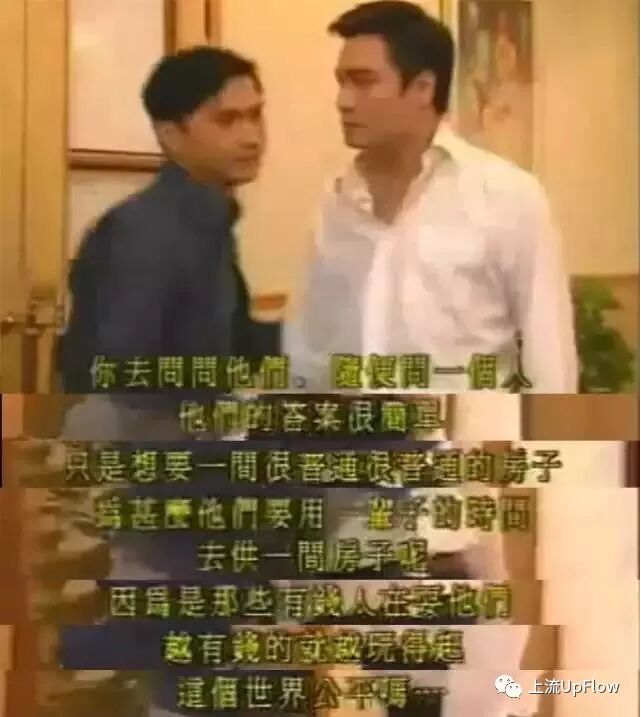 ▲TVB剧集《创世纪.地产风云》里的台词截图:资本市场中的资本掌握者可以翻云覆雨,而一个普通人需要用一辈子的时间去攒钱供楼,这样公平吗?