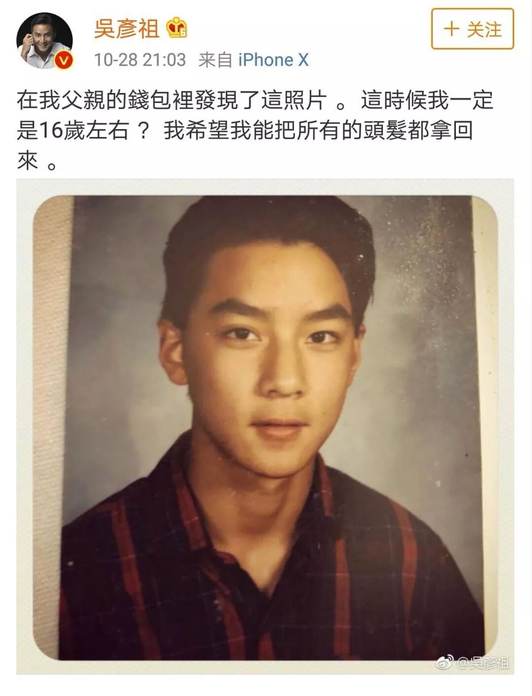 真·吴彦祖上个月就在微博上发布了一张自己十六岁左右的照片,并配文“我希望我能把所有的头发都拿回来。”