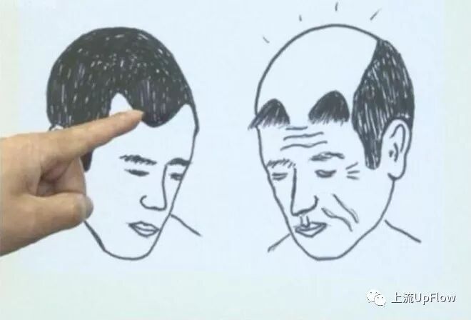 脱发的两个明显特征就是发际线后退和发量少。把刘海掀起来就是光明顶。梳中分,左右两边的头发像隔着一个太平洋。