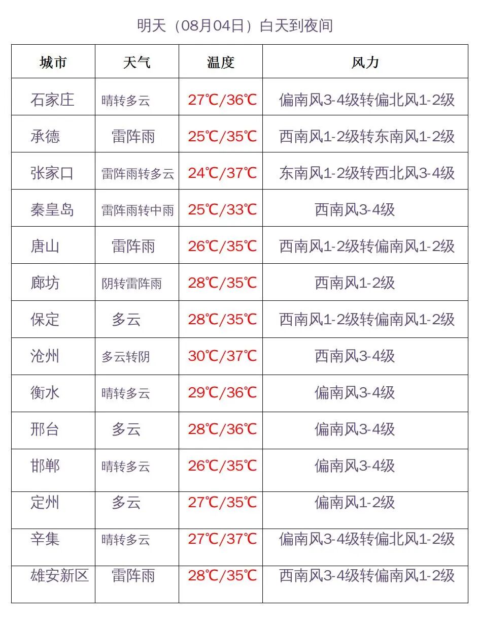 明天夜间到5日,保定、廊坊及以北地区和石家庄西部、邢台西部阴有雷阵雨,其中承德东部、唐山、秦皇岛局地有中到大雨,个别地点有暴雨,其他地区多云。