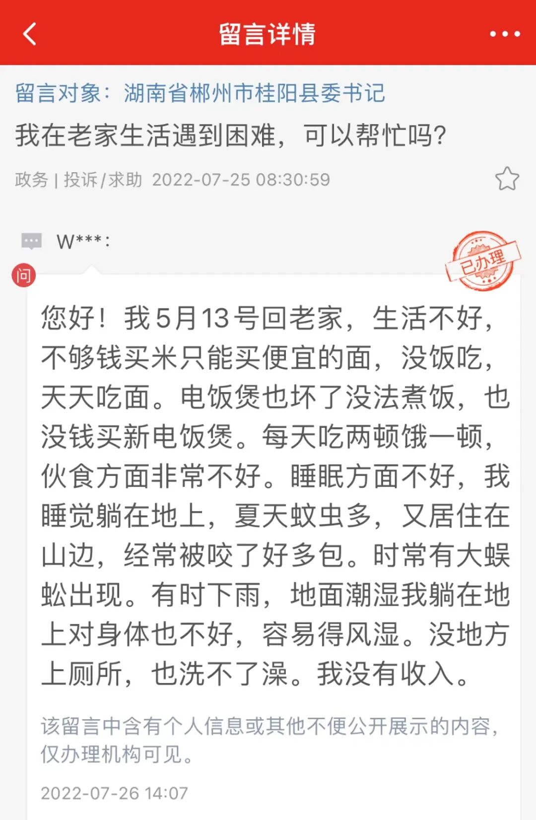 近日,“领导留言板”的一则官方回应,引发关注。7月25日,有网友向湖南省郴州市桂阳县委书记留言称:自己5月13号回老家,“没饭吃”“睡眠方面不好”“没有收入”......