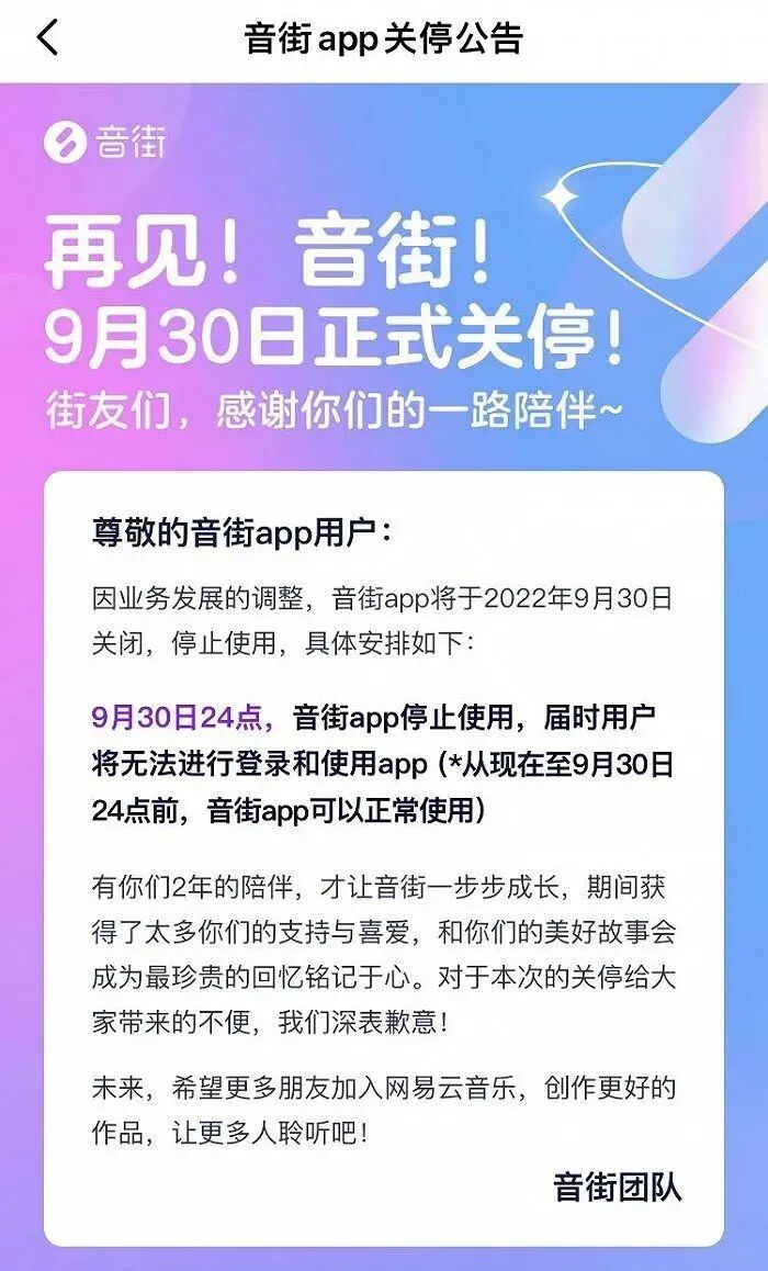网易云音乐旗下K歌App“音街”日前发布公告称,因业务发展的调整,音街App将于2022年9月30日关闭,届时用户将无法进行登录和使用App(从现在至9月30日24点前,音街App可以正常使用)。目前,音街App的相关功能(K歌、歌房)均可在网易云音乐使用。