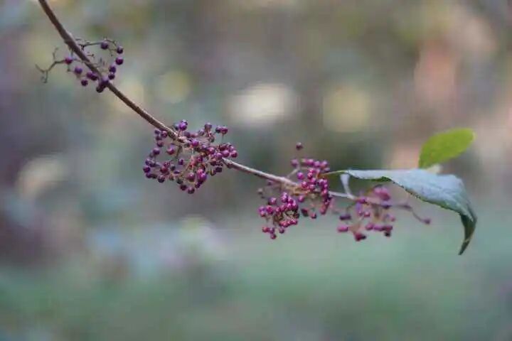 有一株灌木上结了很多的小果,汇聚成紫色的小球,成串挂在枝头,珠圆玉润,异常美丽,犹如一串串耀眼夺目的“紫珍珠”。这是华紫珠的果实,具有很强的观赏性,不妨到分类区找找它。