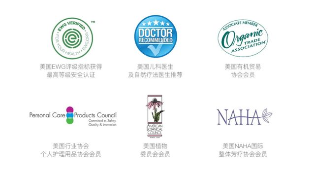 天然的植物萃取成分安全健康,尤其适合6个月以上的宝宝和孕期的准妈妈们使用。这个品牌所用的原料几乎获得了大部分美国权威有机认证机构的认证: