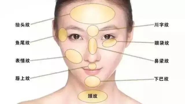 额头纹、眉间川字纹、法令纹、嘴角纹,