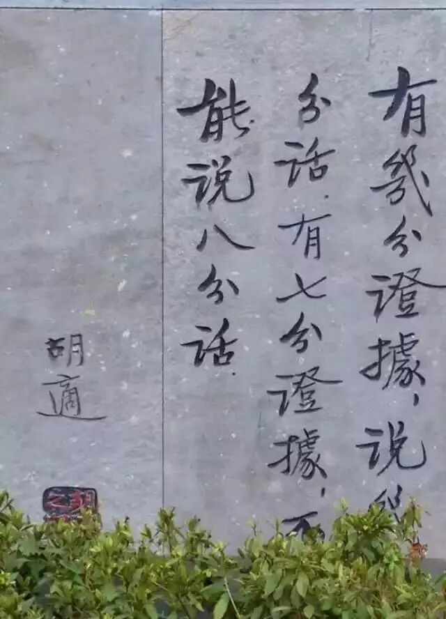 墓志铭:这是胡适先生的墓,生于中华民国纪元前二十一年,卒于中华民国五十一年。这位为学术和文化的进步,为思想和言论的自由,为民族的尊荣,为人类的幸福而苦心焦思、敝精劳神以致身死的人,现在在这里安息了。我们相信形骸终要化灭,陵谷也会变易,但现在墓中这位哲人所给予世界的光明,将永远存在。