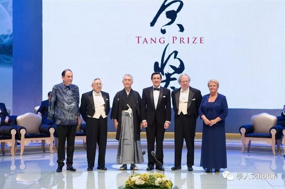 唐奖颁奖典礼后,台湾总统马英九(右三)和法治奖奥比·萨克思(左起)、汉学奖余英时、生技医药奖本庶佑及詹姆斯·艾利森、永续发展奖格罗·哈莱姆·布伦特兰合影。图/陈君玮