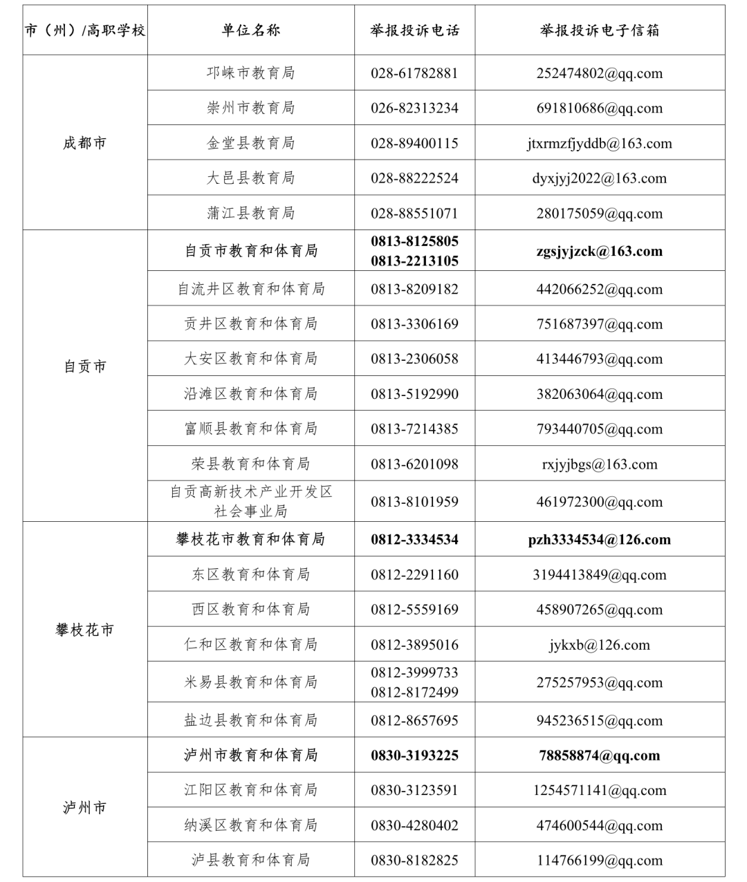 为贯彻落实《四川省人民政府教育督导委员会关于印发〈2022年四川省职业学校办学突出问题专项整治工作方案〉的通知》(川教督委〔2022〕3号)精神,畅通职业学校办学突出问题反映渠道,切实维护学生合法权益,现将四川省职业学校办学突出问题举报投诉电话和电子信箱予以公布。