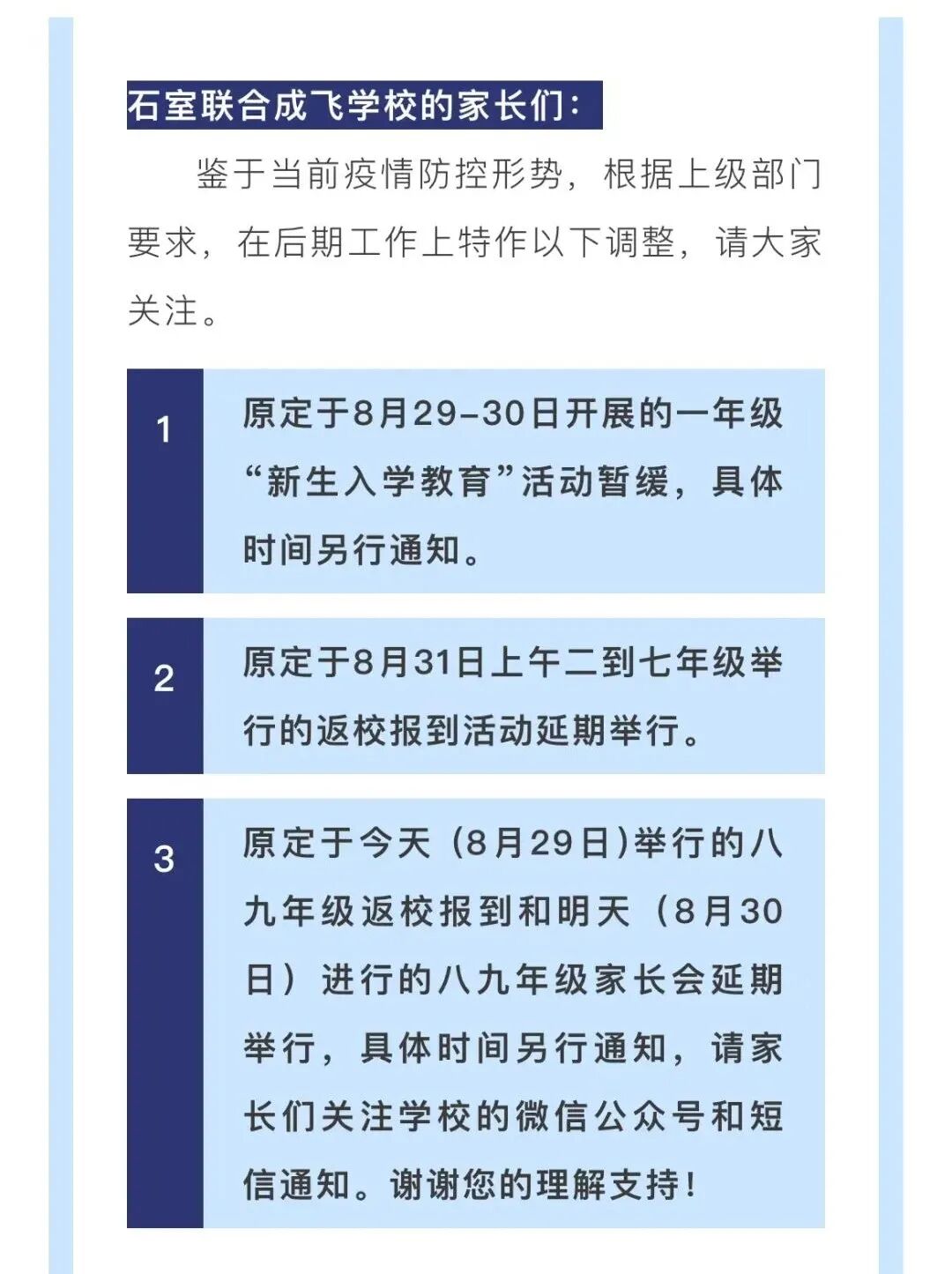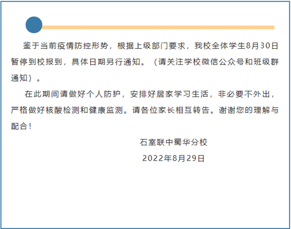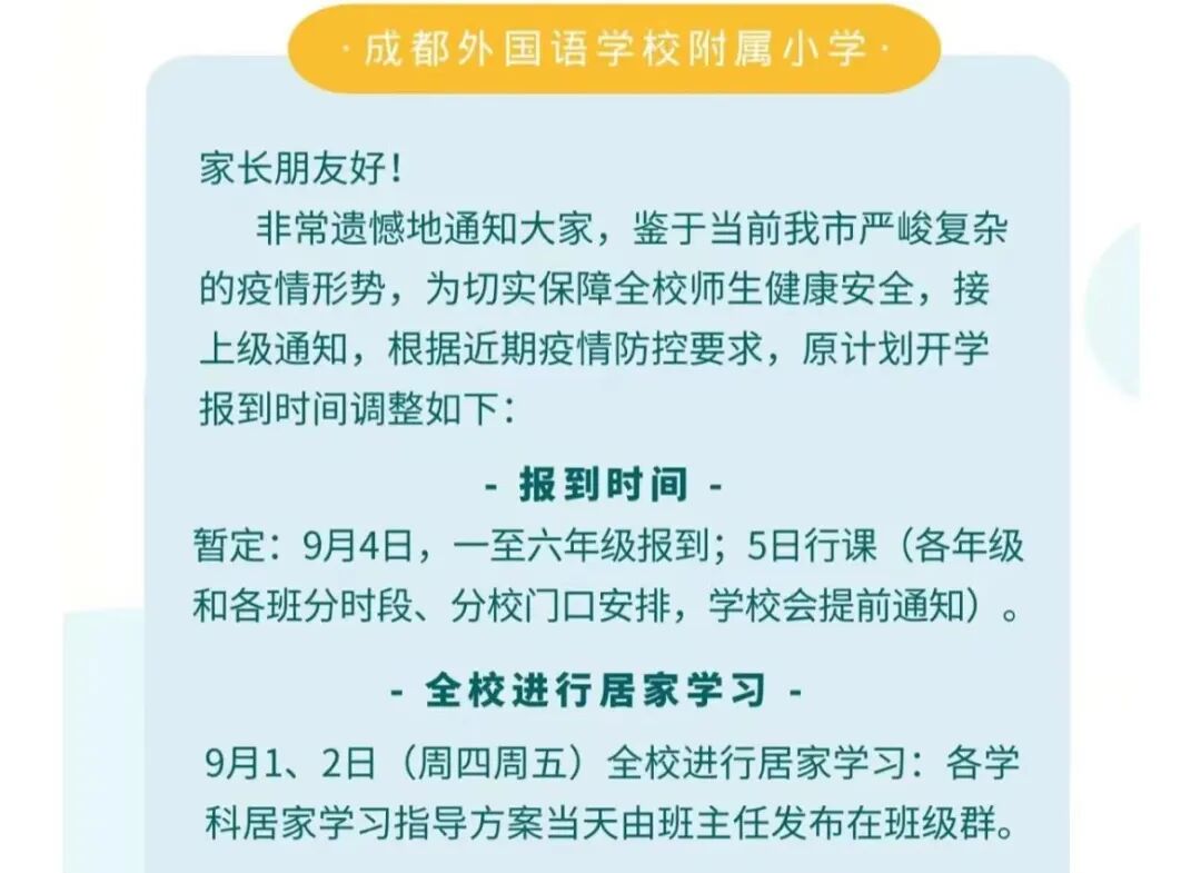 8月29日,成都石室联合中学发布通知,表示原定于8月29—30日开展的一年级 “新生入学教育”活动暂缓,具体时间另行通知。原定于8月31日上午二到七年级举行的返校报到活动延期举行。原定于今天(8月29日)举行的八九年级返校报到和明天(8月30日)进行的八九年级家长会延期举行,具体时间另行通知,请家长们关注学校的微信公众号和短信通知。8月29日,成都外国语学校发布《紧急通知》,表示鉴于当前成都市严峻复杂的疫情形势,为切实保障全校师生健康安全,根据市教育局通知,学校初一、初二、初三、高一、高二年级及国际部各年级开学时间延迟至9月5日。返校报到时间为9月4日下午,各年级具体安排将通过学校官方微信公众号发布。8月29日,成都外国语学校附属小学发布通知,表示鉴于当前成都市严峻复杂的疫情形势,为切实保障全校师生健康安全,接上级通知,根据近期疫情防控要求,原计划开学报到时间调整如下:一至六年级报到时间暂定为9月4日;5日行课(各年级和各班分时段、分校门口安排,学校会提前通知。)9月1、2日(周四周五)全校进行居家学习:各学科居家学习指导方案当天由班主任发布在班级群。8月29日,成都实验外国语学校发布通知,表示鉴于当前疫情形势,学校初中、高一、高二、国际部各年级开学时间暂定为9月5日。各年级返校及具体安排将通过学校官方微信公众号发布。![]()