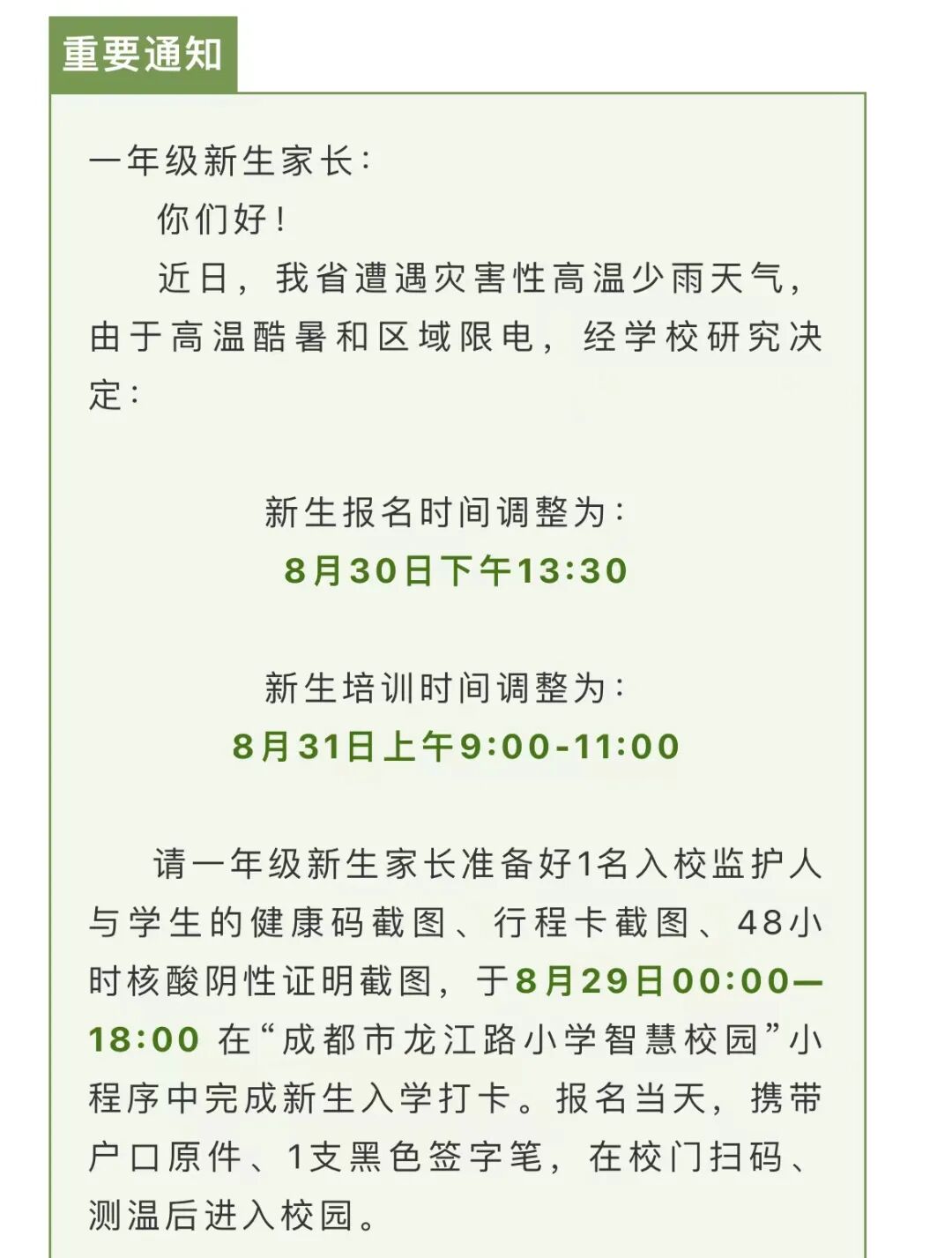8月27日,成都市龙江路小学发布《重要通知:延期!新生入学报到时间变动!》,表示近日我省遭遇灾害性高温少雨天气,经学校研究决定新生报名时间调整为:8月30日下午13:30;新生培训时间调整为:8月31日上9:00-11:00。![]()