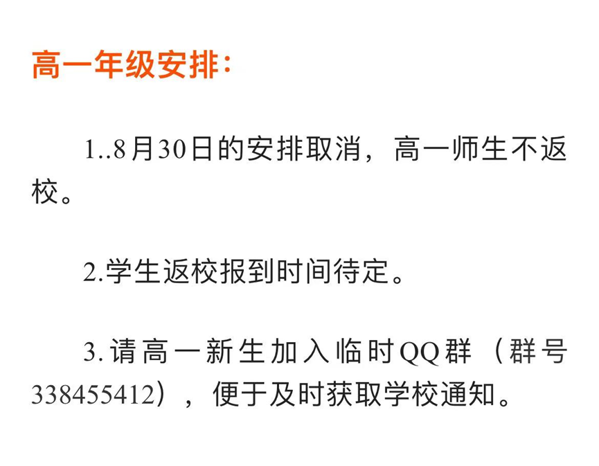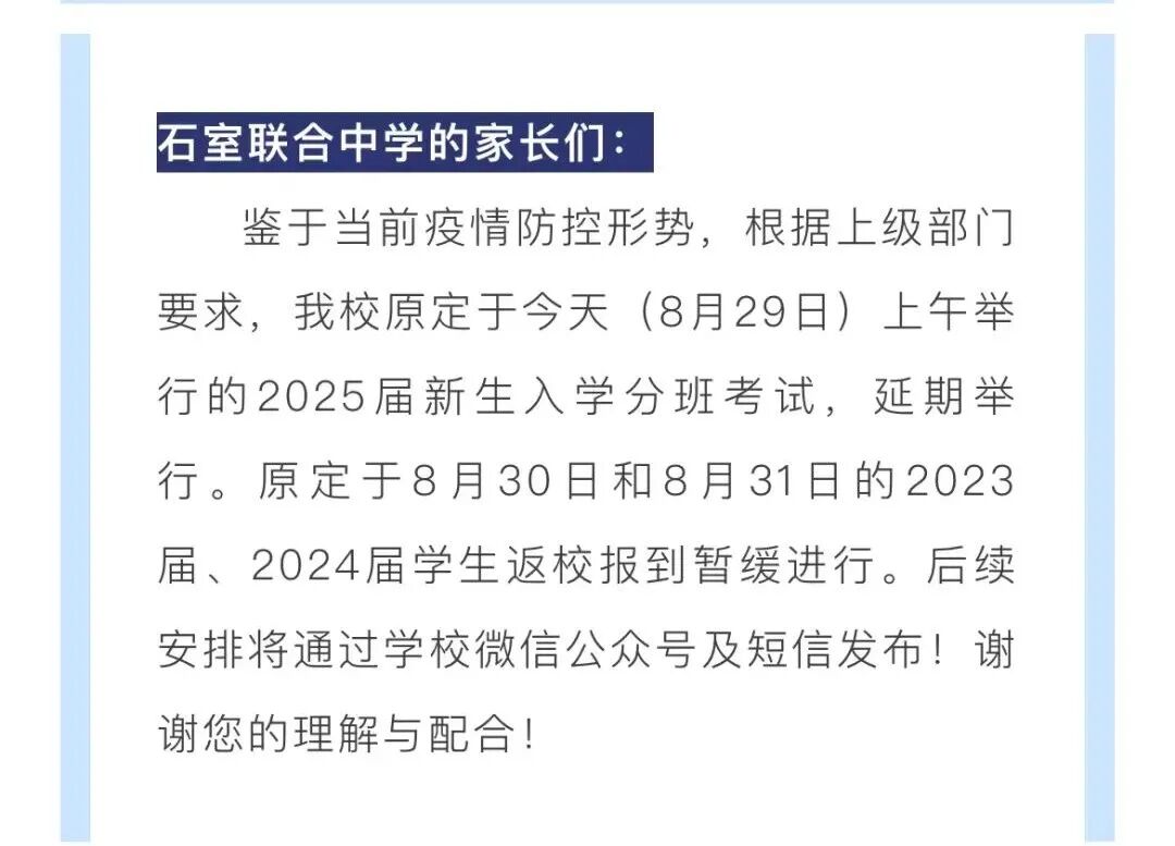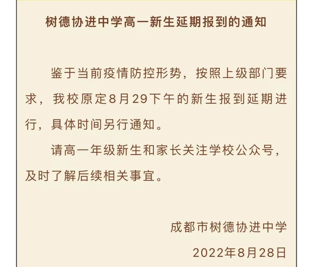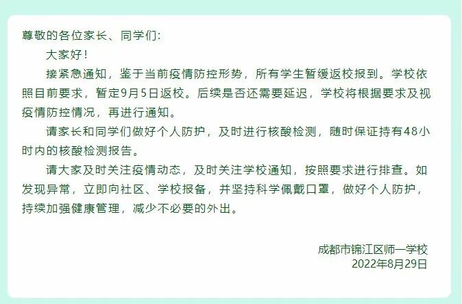 8月29日,成都市锦江区师一学校发布《关于暂缓返校报道的紧急通知》,表示鉴于当前疫情防控形式,所有学生暂缓返校报到。学校依照目前要求,暂定9月5日返校。后续是否还需要延迟,学校将根据要求及视疫情防控情况,再进行通知。8月29日,成都石室联合中学发布通知,表示鉴于当前疫情防控形势,根据上级部门要求,学校原定于今天(8月29日)上午举行的2025届新生入学分班考试,延期举行。原定于8月30日和8月31日的2023届、2024届学生返校报到暂缓进行。后续安排将通过学校微信公众号及短信发布。