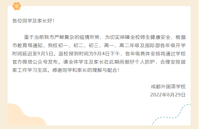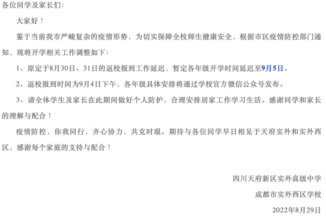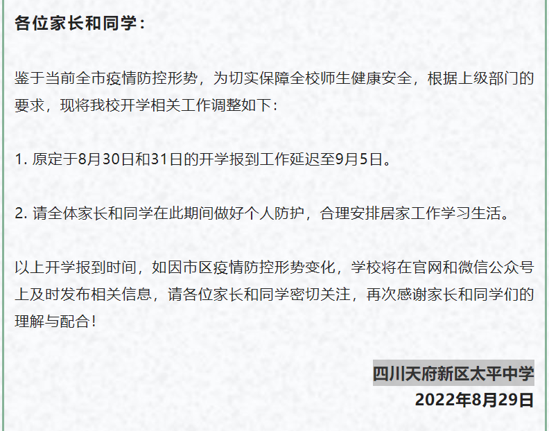 8月29日,四川天府新区太平中学发布通知,表示因成都市疫情防控形势严峻,为切实保障全体师生健康安全,根据上级部门的要求,现将原定于8月30日和31日的开学报到工作延迟至9月5日。