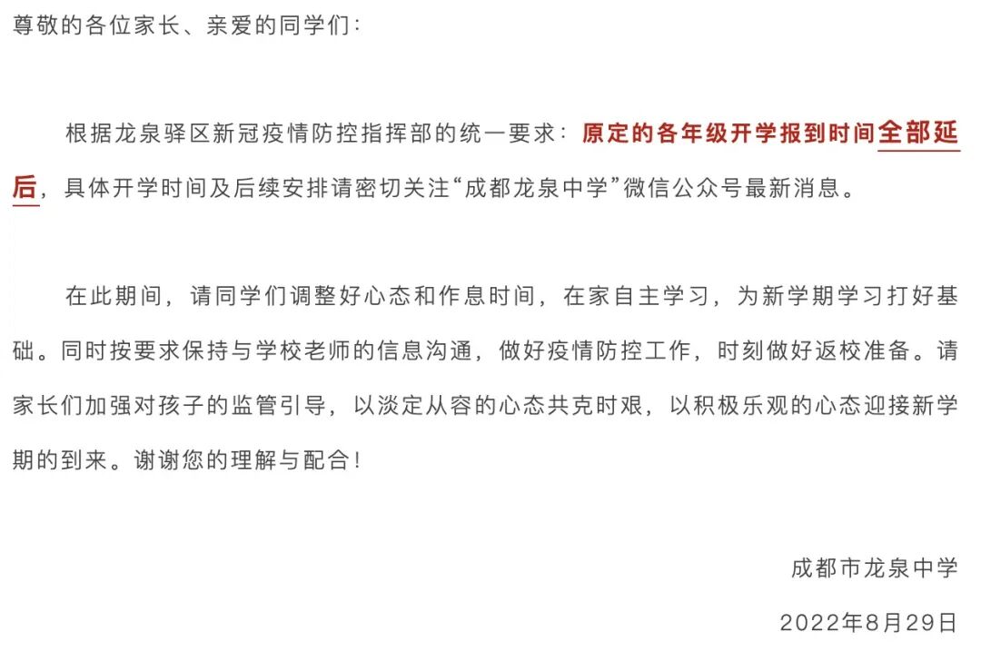 8月29日,成都市龙泉中学发布通知,表示根据龙泉驿区新冠疫情防控指挥部的统一要求:原定的各年级开学报到时间全部延后,具体开学时间及后续安排请密切关注“成都龙泉中学”微信公众号最新消息。