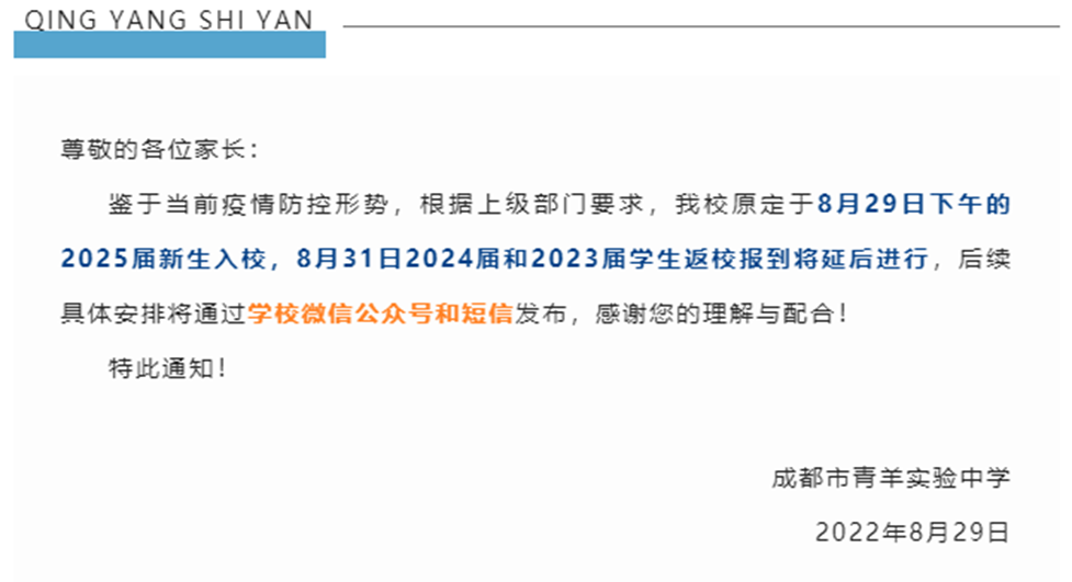 8月29日,成都市青羊实验中学发布通知,表示鉴于当前疫情防控形势,根据上级部门要求,学校原定于8月29日下午的2025届新生入校,8月31日2024届和2023届学生返校报到将延后进行,后续具体安排将通过学校微信公众号和短信发布。8月29日,成都市第三十八中学校发布公告,表示8月30日的安排取消,高一师生不返校,学生返校报到时间待定。8月29日,石室联中蜀华分校发布通知,表示鉴于当前疫情防控形势,根据上级部门要求,学校全体学生8月30日暂停到校报到,具体日期另行通知。