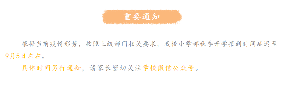 8月29日,双眼井小学发布通知,表示鉴于当前疫情防控形势,根据上级部门要求,学校原定于8月30日上午的新生报到及8月31日上午的2—6年级学生报到将延期举行,具体时间另行通知,后续安排请关注学校微信公众号及班级信息发布。![]()