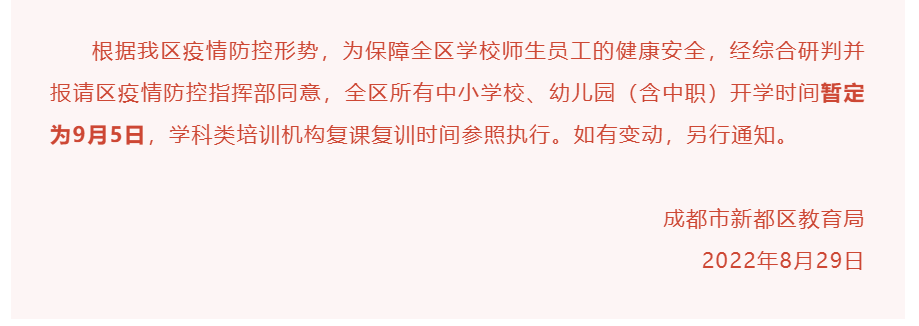 8月29日,新都区教育局发布紧急通知,表示鉴于根据疫情防控形势,为保障全区学校师生员工的健康安全,经综合研判并报请区疫情防控指挥部同意,全区所有中小学校、幼儿园(含中职)开学时间暂定为9月5日,学科类培训机构复课复训时间参照执行。