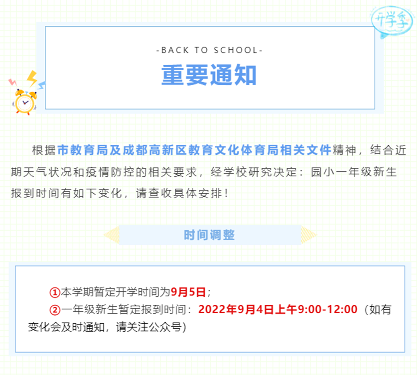 8月28日,成都高新区公园小学发布通知,表示根据市教育局及成都高新区教育文化体育局相关文件精神,结合近期天气状况和疫情防控的相关要求,经学校研究决定:园小一年级新生报到时间有如下变化,学期暂定开学时间为9月5日,一年级新生暂定报到时间:2022年9月4日上午9:00-12:00。