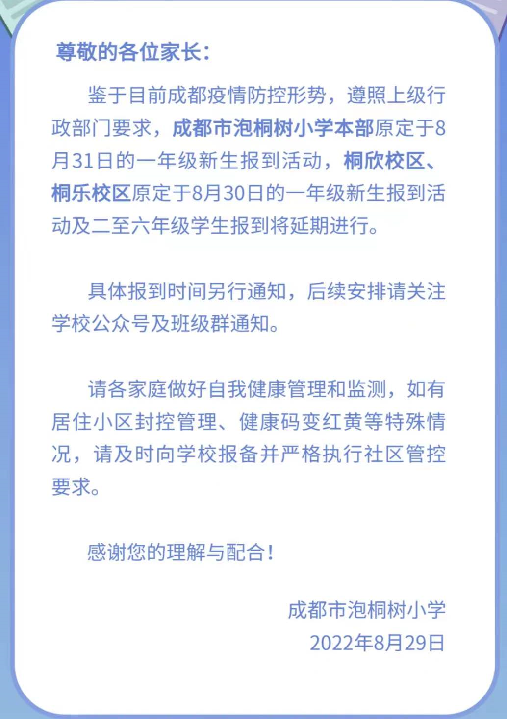 8月29日,成都市泡桐树小学发布关于三校区秋季开学报到延期的紧急通知,表示鉴于目前成都疫情防控形势,遵照上级行政部门要求,成都市泡桐树小学本部原定于8月31日的一年级新生报到活动,桐欣校区、桐乐校区原定于8月30日的一年级新生报到活动及二至六年级学生报到将延期进行。