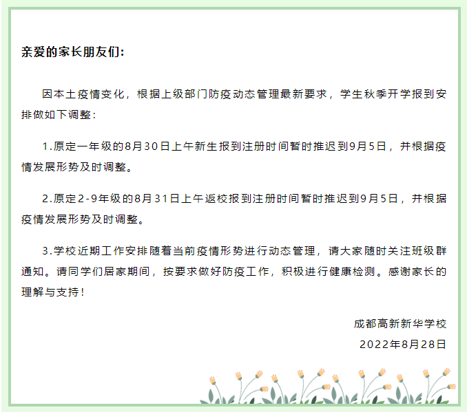 8月28日,成都高新新华学校发布通知,表示因本土疫情变化,根据上级部门防疫动态管理最新要求,学生秋季开学报到安排做如下调整——原定一年级的8月30日上午新生报到注册时间暂时推迟到9月5日,并根据疫情发展形势及时调整。原定2-9年级的8月31日上午返校报到注册时间暂时推迟到9月5日,并根据疫情发展形势及时调整。