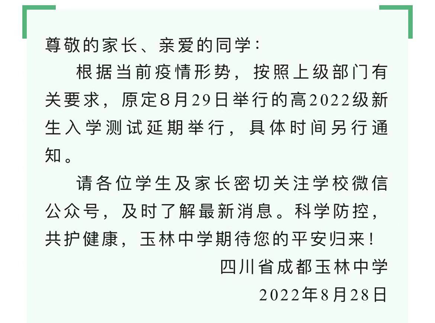 8月28日,成都玉林中学发布《关于高2022级新生入学测试延期的公告》,表示根据当前疫情形势,按照上级部门有关要求,原定8月29日举行的高2022级新生入学测试延期举行,具体时间另行通知。请各位学生及家长密切关注学校微信公众号,及时了解最新消息。