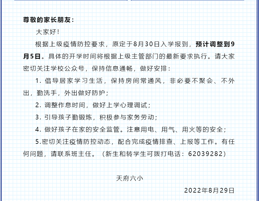 8月29日,四川天府新区第六小学发布通知,表示根据上级疫情防控要求,原定于8月30日入学报到,预计调整到9月5日。具体的开学时间将根据上级主管部门的最新要求执行。