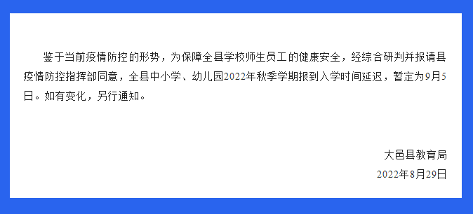 8月29日,大邑县教育局发布《关于中小学幼儿园延迟报到入学的公告》,表示鉴于当前疫情防控形势,为保障全县师生员工的健康安全,经综合研判并报请县疫情防控指挥部同意,全县中小学、幼儿园2022秋季学期报到入学时间延迟,暂定为9月5日。如有变化,另行通知。