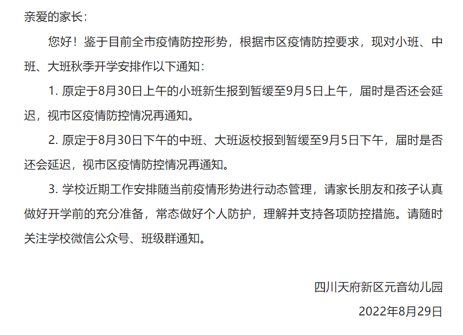 8月29日,四川天府新区元音幼儿园发布《关于延迟2022年秋季开学重要通知》,表示鉴于目前全市疫情防控形势,根据市区疫情防控要求,现对小班、中班、大班秋季开学安排作以下通知:1. 原定于8月30日上午的小班新生报到暂缓至9月5日上午,届时是否还会延迟,视市区疫情防控情况再通知。2. 原定于8月30日下午的中班、大班返校报到暂缓至9月5日下午,届时是否还会延迟,视市区疫情防控情况再通知。