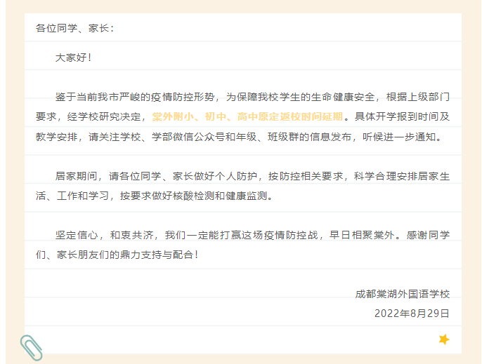 8月29日,成都棠湖外国语学校发布通知,表示鉴于当前成都市严峻的疫情防控形势,为保障全校学生的生命健康安全,根据上级部门要求,经学校研究决定,棠外附小、初中、高中原定返校时间延期。具体开学报到时间及教学安排,请关注学校、学部微信公众号和年级、班级群的信息发布,听候进一步通知。