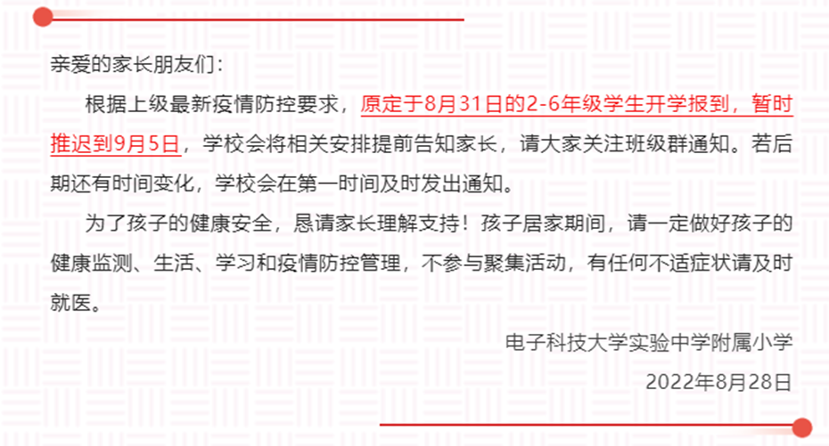 8月28日,电子科技大学实验中学附属小学发布通知,表示根据上级最新疫情防控要求,原定于8月31日的2-6年级学生开学报到,暂时推迟到9月5日,学校会将相关安排提前告知家长,请大家关注班级群通知。