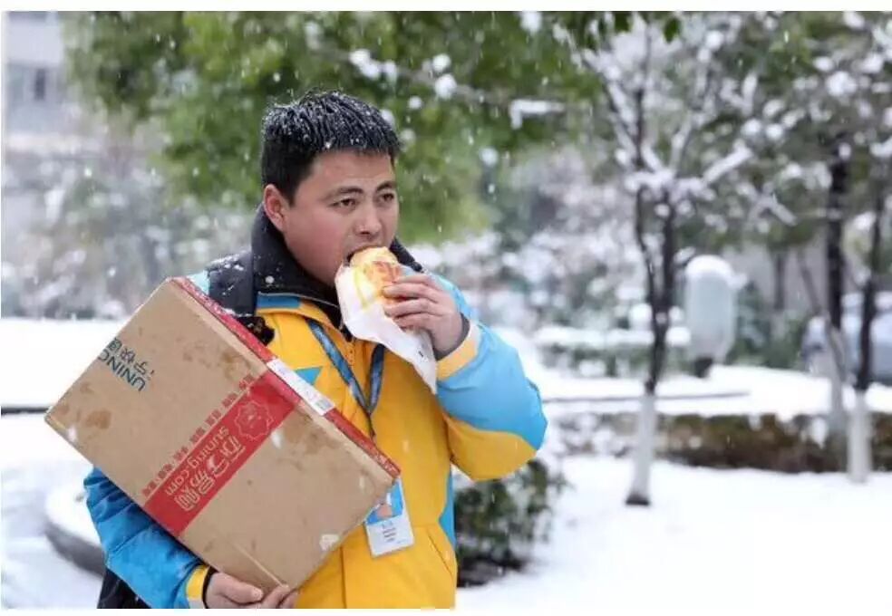 是张快递小哥的照片:下雪的街上,他左手夹着庞大的快递盒,右手拿着一块面包,费劲的往嘴里塞。雪花落到他的头上,又化了。