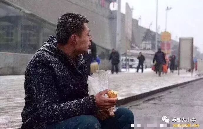 西安火车站,一位摄影师拍到了这位农民工,顶风冒雪等生意。