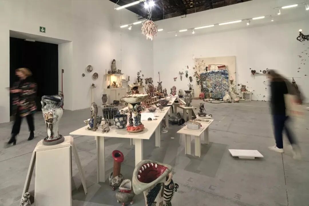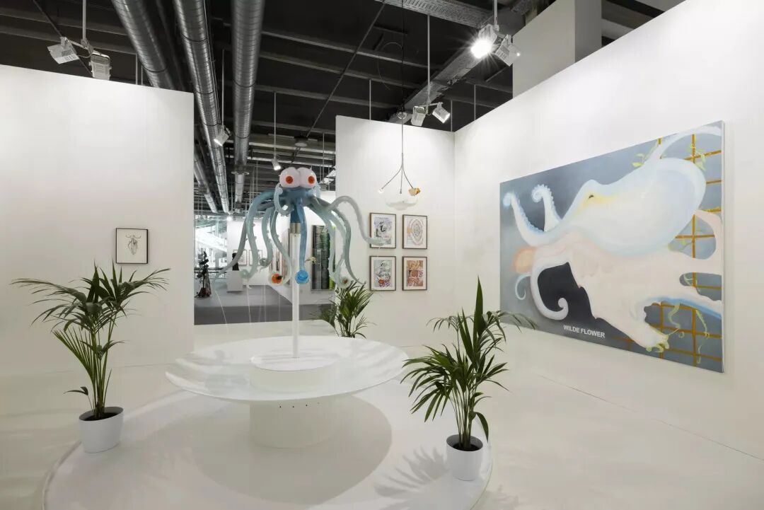就纯粹的乐趣而言,Carlier | gebauer的展位无出其右。当你进入展位时,阿斯塔·格罗丁(Asta Gröting)的巨大的聚氨酯睡莲叶就会带头迎接——它们或是悬挂在墙上,或是扑倒于地面。不过,展位上最吸引人的仍然是劳尔·普鲁沃斯特(Laure Prouvost)的作品。荣获特纳奖的普鲁沃斯特乐于在自己的女权主义作品中注入些诙谐的元素,这一特色在画廊的展位上彰显地淋漓尽致。在展览中心不断喷水的《这意味着》(This Means, 2019)是一个部分是章鱼、部分是乳房的玻璃喷泉;而在相邻的墙上,一只类似的性爱章鱼则漂浮在一幅粉彩油画的表面。