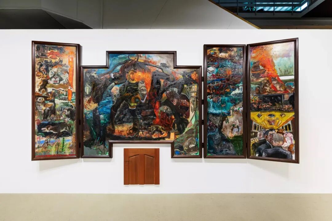 西莱斯特·杜普伊-斯宾塞(Celeste Dupuy-Spencer)是一位在美国崭露头角的画家,但正如 Nino Mier 展位的工作人员所言,该画廊在今年博览会上的目标之一就是将她推广给国际观众。四屏多联画《向海投掷的岩石形状》(The shape of the rock that's hurling towards the sea,2022)在展位上占主导地位,延续了艺术家对美国经验与父权制遗产的探索。这件近18英尺长的作品充满了百科全书式的艺术史指涉,以末日的景观表达了“原始的女性愤怒”。