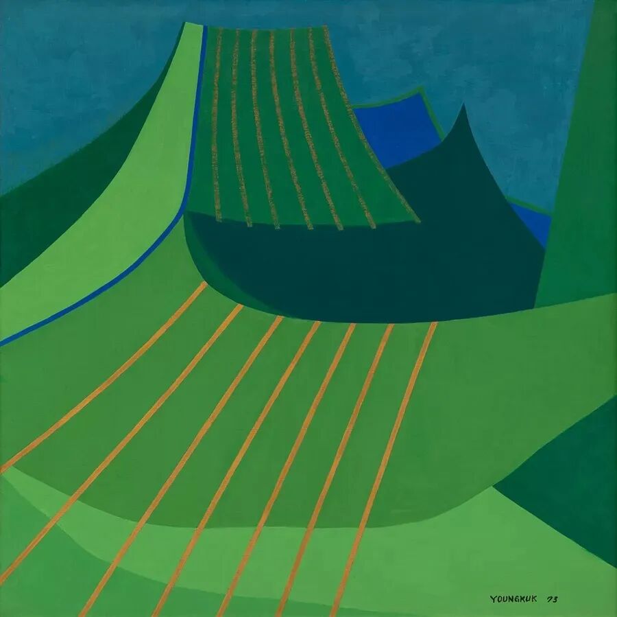 许多首尔的老牌画廊都选择既在弗里兹也在 Kiaf 上展出,以类似的艺术家名录面对可能不同的藏家群体。Kukje 画廊位于该市画廊林立的三清区以及南部港口城市釜山,是一家拥有40年历史的艺术机构。面对全球,画廊着重推广韩国艺术家;而在韩国国内,画廊则聚焦代理国际知名艺术家。借助大型群展以及吸引眼球的配对展示,画廊的展位将这种双重性体现得淋漓尽致:法国雕塑家 Jean Michel Othoniel 的灰色大型镜面玻璃珠雕塑《Noeud Sauvage》(2020)就与已故韩国画家柳永国(Yoo Youngkuk)以不同绿色呈现的抽象景观《Mountain》(1973)相邻,雕塑的圆润感与画中暗指的山丘所拥有的诗意锐度形成了微妙的对比。大自然也是李基丰(Kibong Rhee)由大型树脂玻璃制成、以非周期性混合媒材为特色的画作主角:油画的标题《Backside of the memory》(2016)恰如其分,以其特有的雾状表面体现了记忆的“泡腾”感。