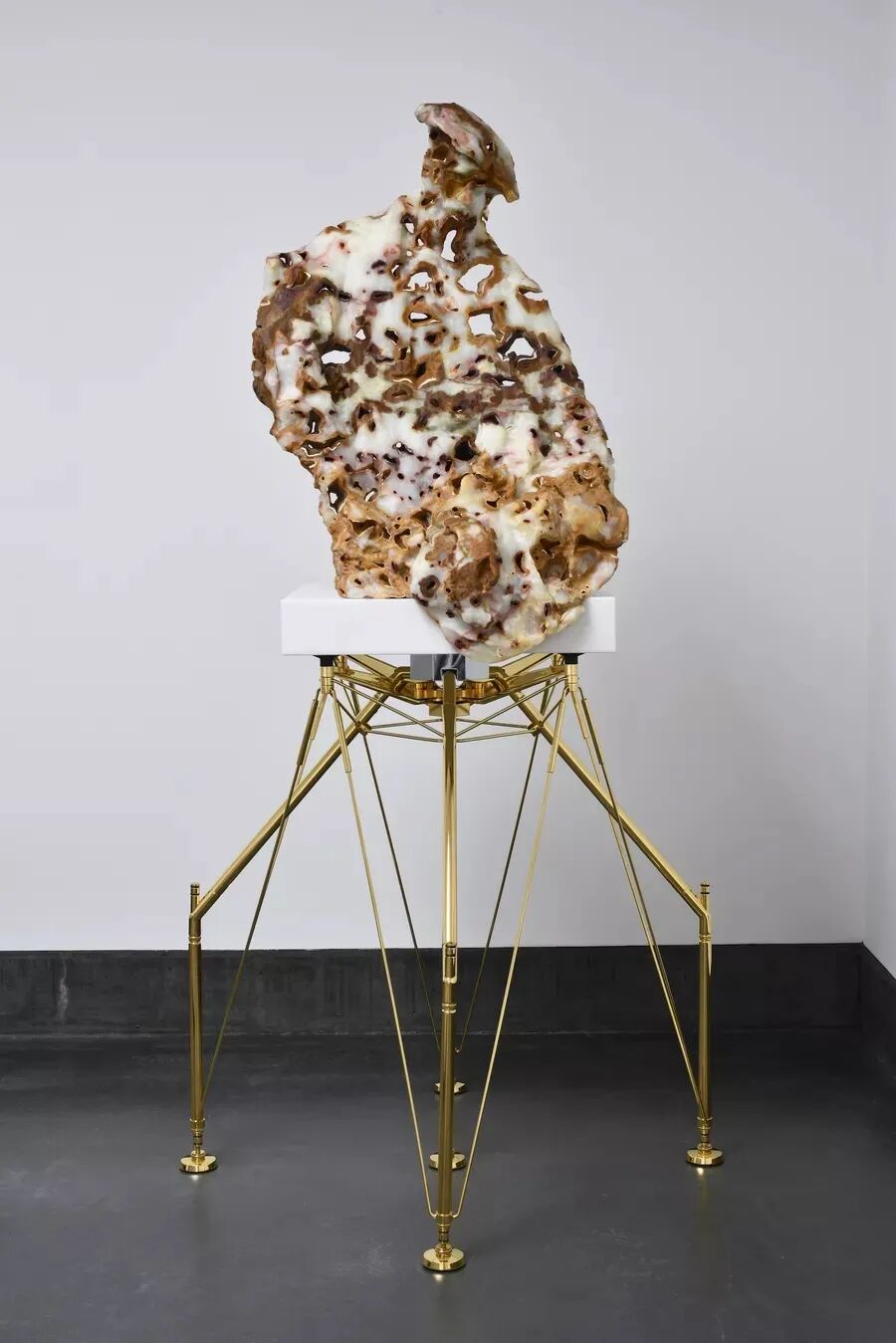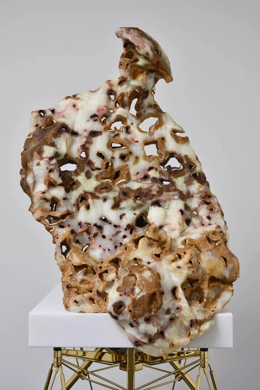 在此次参展的数百个画廊展位中,韩国科技公司 LG 选择展示其与纽约艺术家 Barry X Ball 的合作成果。Ball 的一件生物形态大理石雕塑被选入了展览,看似矜持却又令人惊恐的作品吸引着观众仔细检查它的肉体特征。透过大理石的闪亮纹理,犹如真菌的表面拥有了某种流动感。与雕塑对触觉的强调截然不同,艺术家与 LG 的 NFT 合作成果则在相邻的电视屏幕上运行。全名为《Granulo-Specular Chiaroscuro Meta-Morphs (Alchemic Black Steel, Alchemic Gold, Alchemic Silver, Alchemic Copper)》的 NFT 作品展示了以不同材料制成、展现身体形态的雕塑,其以假乱真的程度几乎蒙蔽了观众的眼睛。