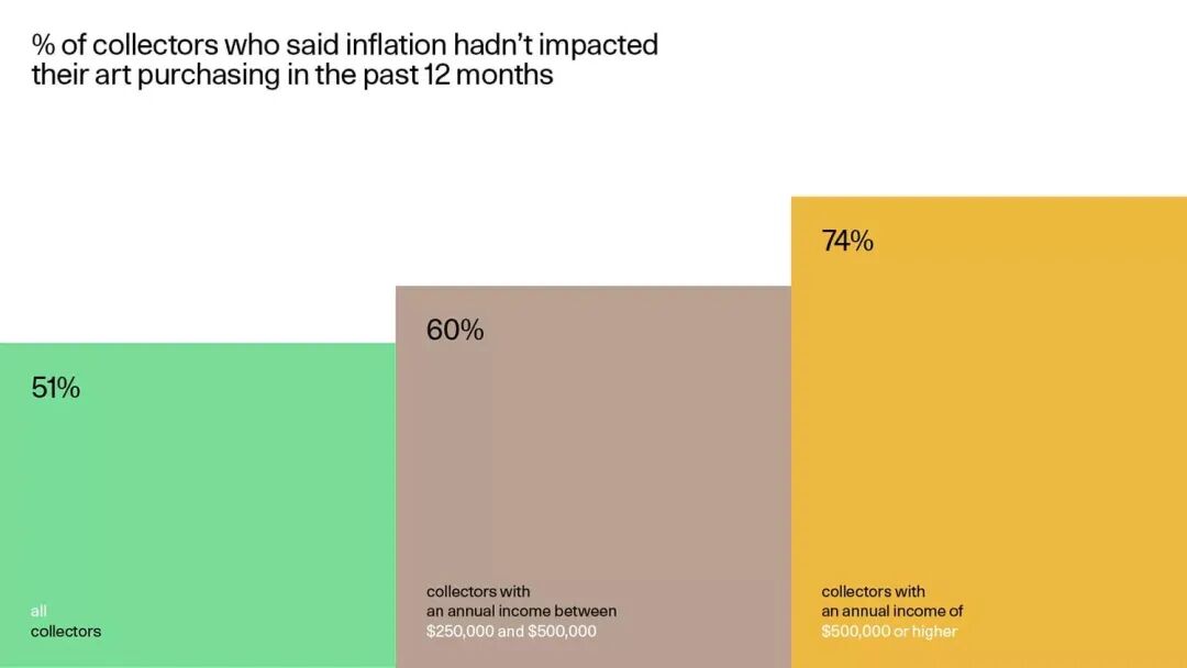 事实上,近60%的收入在25万至50万美元之间的藏家表示,通货膨胀并没有让他们改变对艺术品的消费。对于那些收入超过50万美元的人来说,这个数字更增长到了74%——在这个层级的藏家中,有25%的人在过去12个月内购买的艺术品比前一年还要多。