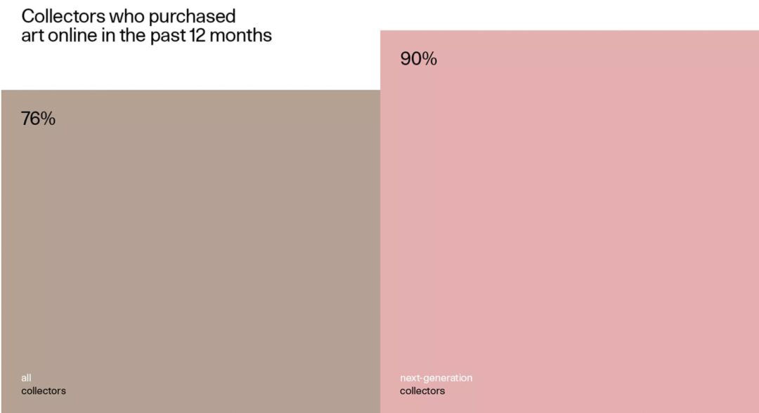 总体而言,在过去的12个月内,有76%的藏家在网上购买了艺术品。对于在过去四年内开始收藏,并且在其中一年内至少花了5000美元购买艺术品的“下一代”藏家来说,线上购买艺术品非常受欢迎,有90%的人在过去一年中选择了这种购买方式。而且,这绝非一次性的消费:在过去一年中,有56%的藏家在网上花费了他们年度艺术预算的一半以上。