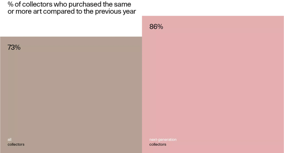 2022年,有73%的藏家购买了与去年相同数量或更多的作品,而2021年,这一数字仍为68%。对于全新的“下一代”藏家来说,这一比例甚至更高,有86%的受访者购买了与去年相同数量或更多的作品(去年为78%)。
