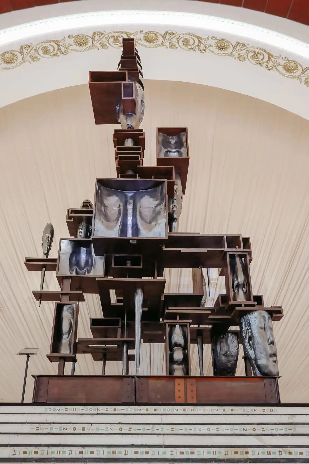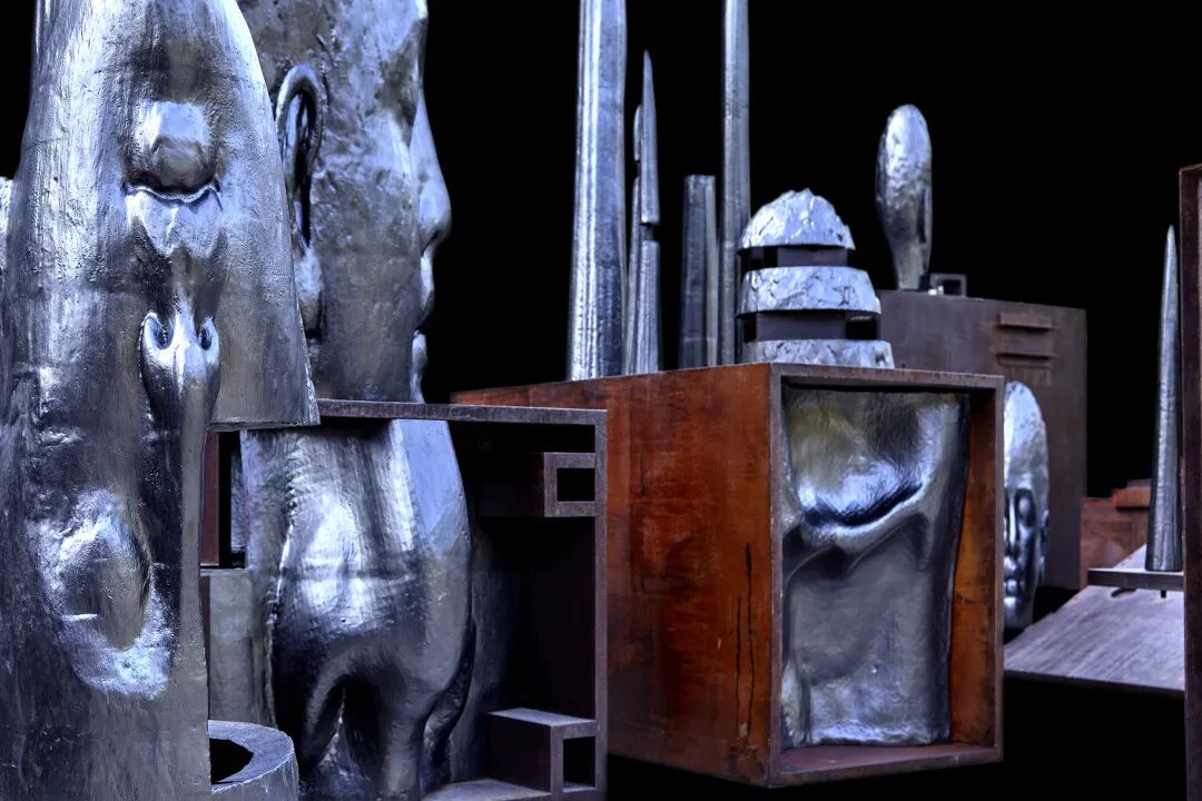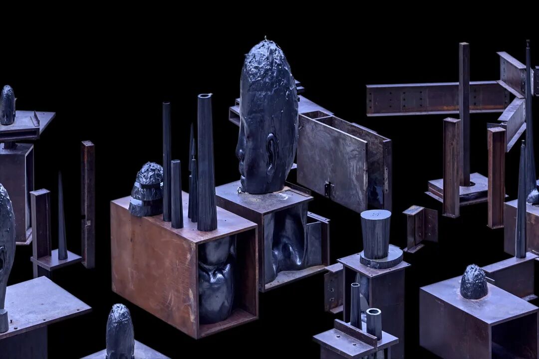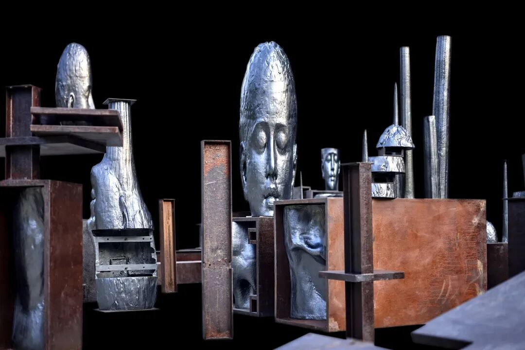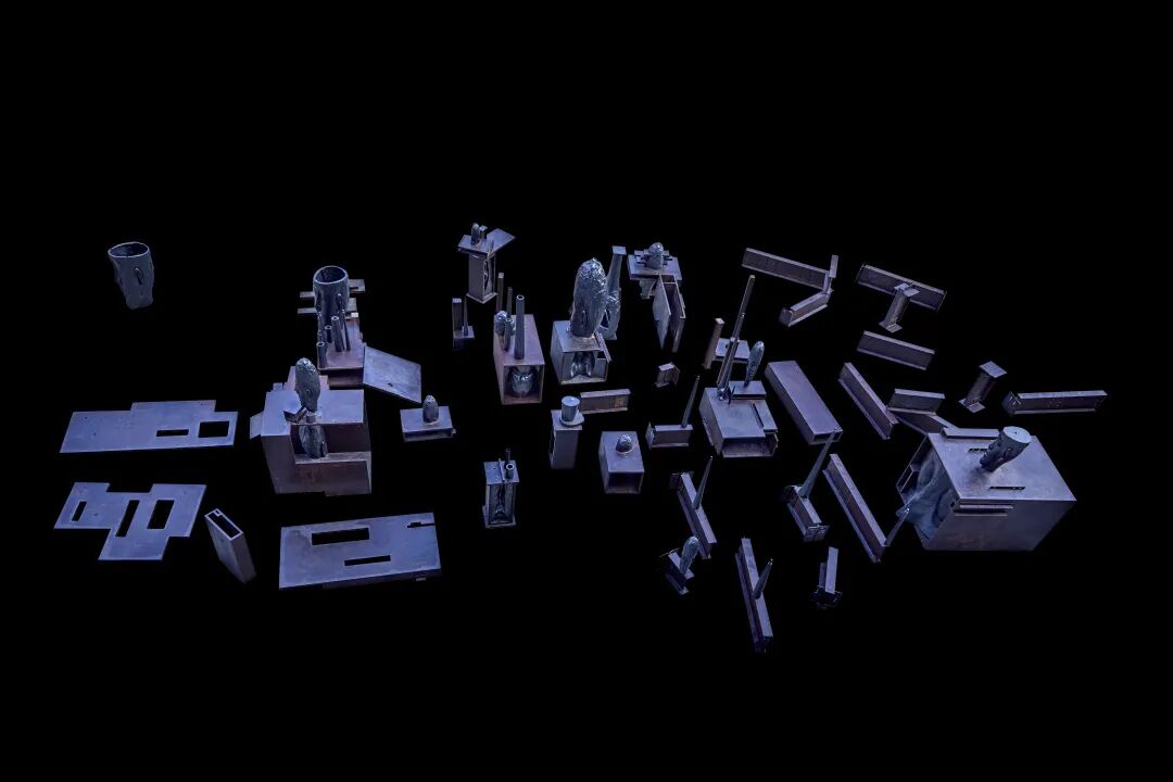 这不是我第一次见到这些雕塑。在2021年的 ART021 艺术博览会上,陈世英的一件高达10米的钛金属雕塑竖立在展厅最显眼的地方,你需要努力仰视才能看清它的全貌。而在威尼斯的展厅内,曾经伟岸的雕塑被拆解成一个个部件,邀请你探索它的内部与过去。很神奇的是,尽管雕塑被拆解,但它反而给你带来一种更肃穆的感觉。也许这正是艺术家试图传递的观感,如同展览名称“TOTEM”一样,是古代原始部落中记载神的灵魂的载体,逡巡期间,你理应敬畏。