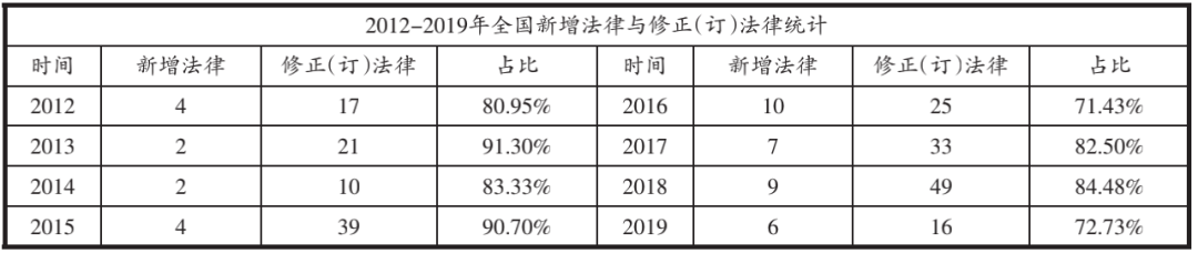 作为我国社会主义民主法制建设史上的重要里程碑2011年3月,全国人大常委会委员长吴邦国在第十一届全国人大会议上宣布,中国特色社会主义法律体系已经形成。至此,我国进入“后立法时代”,自2011年至今我国法律法规新增数目较少但修改频繁,如表1所示,不但修改法律占当年通过法律的比重极大,且大量法律被多次修改。查漏补缺,是我国处于后立法时代的立法现状,不断对法律进行修正和完善,自然是对改革的回应和支撑,契合重大改革于法有据的政治站位,但若常年对多部法律进行多次修改,则会使普通民众对法律内容产生困惑,影响法律的权威性,在法律频频变动的当下,从立法角度考察法律的稳定性与变动性的平衡问题非常必要。